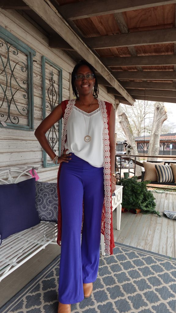 I wanted to share this because I made my vest, and I made my pants. My shirt is ready to wear. I figured out a way to make a cute outfit nursing friendly. Separates are my best friend right now.